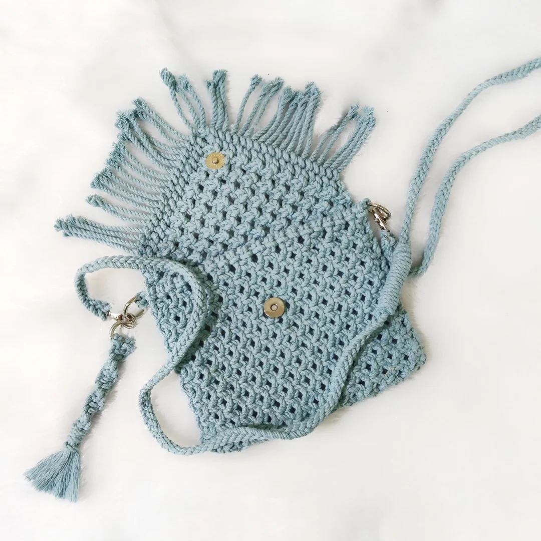Enchanting the senses, a delightful macrame charm adorns one side of the bag, elevating its beauty to new heights. This intricate detail adds a touch of whimsy and character, making each bag a unique work of art.